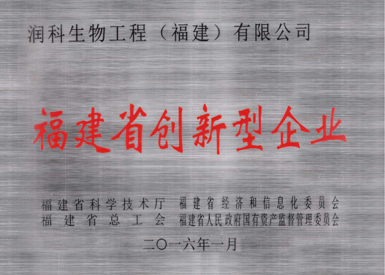 ??????? 2016年1月,福建省科技廳公布第七批共179家“省級(jí)創(chuàng)新型企業(yè)”名單,潤科生物工程(福建)有限公司獲得福建省科技廳、省經(jīng)信委、省總工會(huì)、國資委正式授予的“福建省創(chuàng)新型企業(yè)”稱號(hào),榮登省級(jí)創(chuàng)新型企業(yè)榜單。