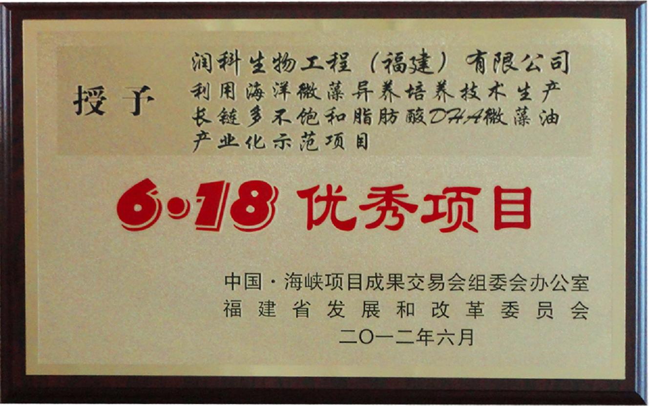 ??????? 潤科生物工程(福建)有限公司研發(fā)課題“利用海洋微藻異養(yǎng)培養(yǎng)技術(shù)生產(chǎn)長鏈多不飽和脂肪酸DHA微藻油產(chǎn)業(yè)化示范項目”被福建省發(fā)改委授予618優(yōu)秀項目。