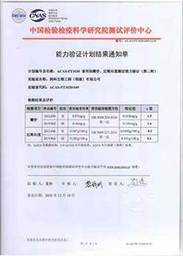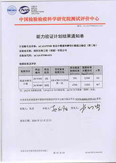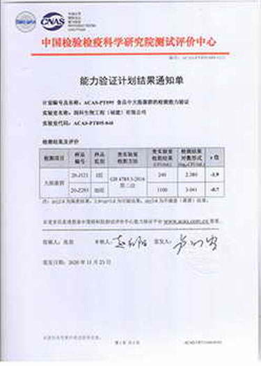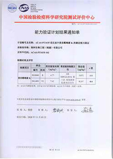 ? ? ? ?潤科生物中心實驗室檢測水平不斷提升,積極參加中國檢驗檢疫科學研究院測試評價中心開展的能力驗證計劃,累計已參與了菌落總數(shù)、黃曲霉毒素B1、鉛、大腸菌群、酸價、過氧化值、霉菌和酵母計數(shù)等多項指標檢測能力驗證,驗證評價結果均為滿意。