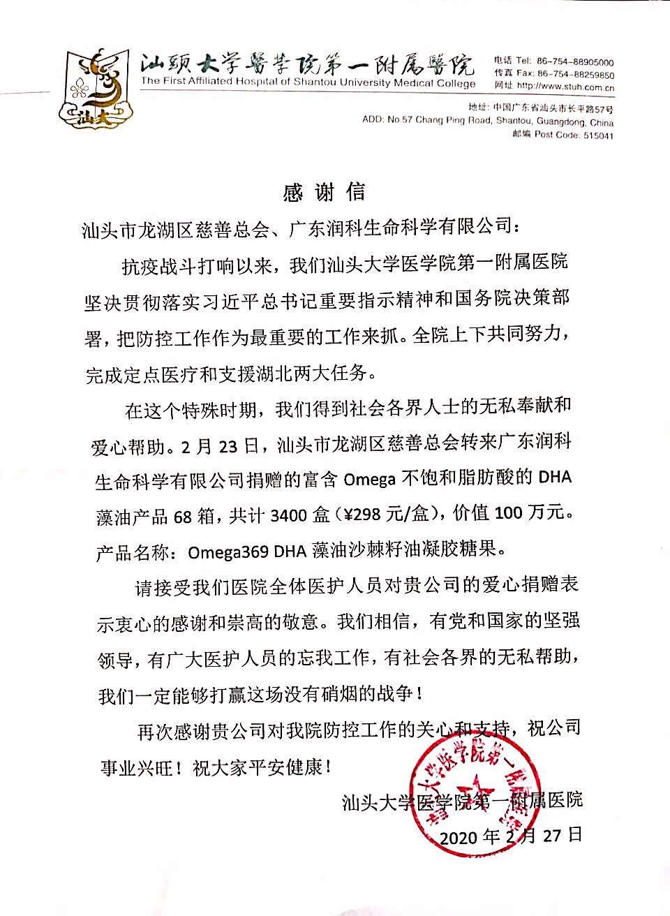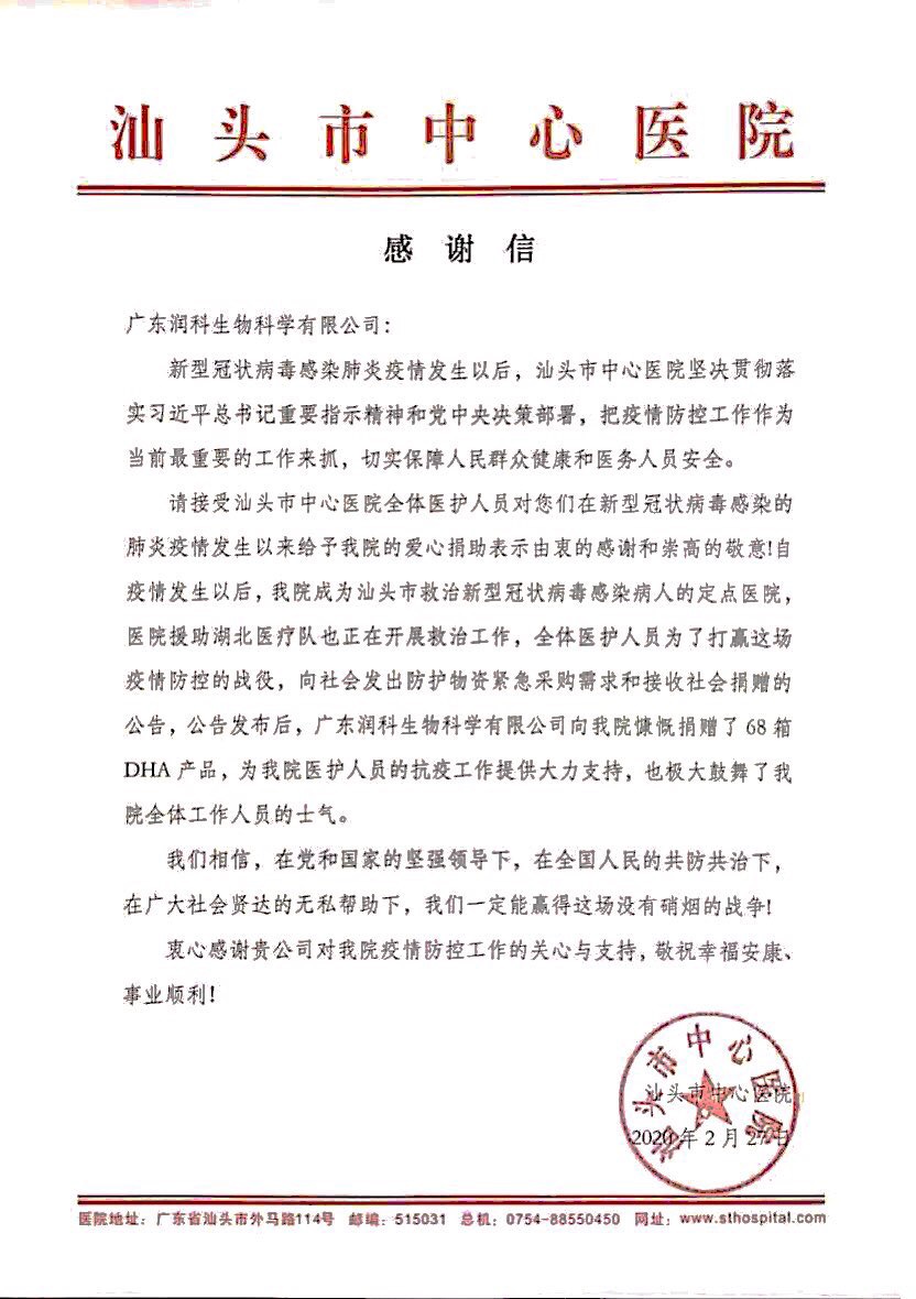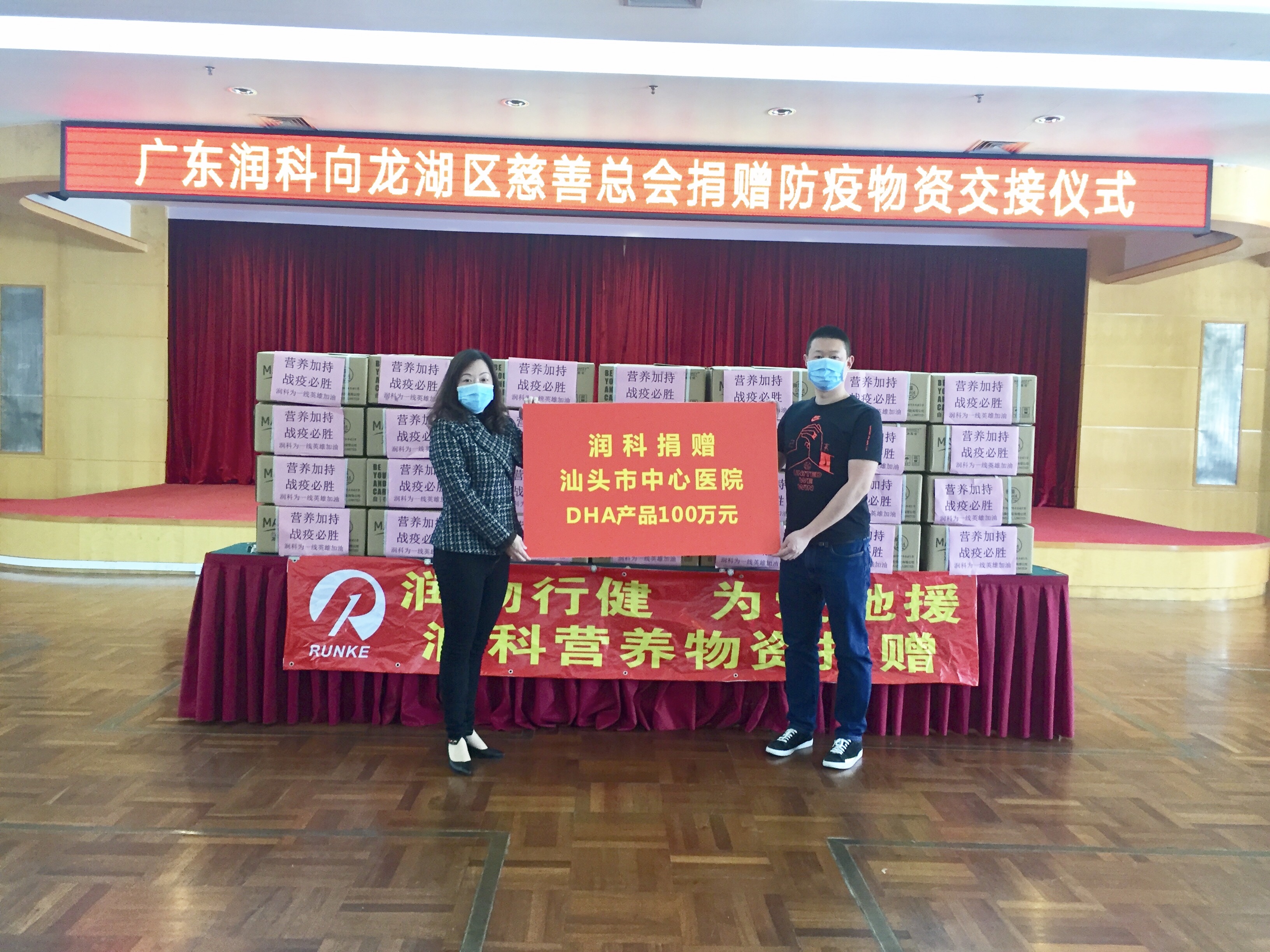 ?????? 2020年2月23日,潤(rùn)科通過汕頭市龍湖區(qū)慈善總會(huì),向汕頭市最先收治新冠肺炎患者的兩家醫(yī)療機(jī)構(gòu)——汕頭市中心醫(yī)院和汕頭大學(xué)醫(yī)學(xué)院第一附屬醫(yī)院,捐贈(zèng)了價(jià)值共200萬(wàn)元的DHA營(yíng)養(yǎng)產(chǎn)品,為抗擊疫情的醫(yī)護(hù)人員們提供營(yíng)養(yǎng)支持。