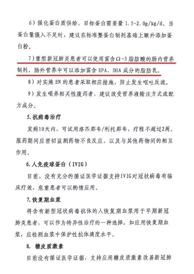 ?????? 2月14日,國(guó)家衛(wèi)健委發(fā)布了新型冠狀病毒肺炎重型、危重型病例診療方案(試行 第二版),將Omega-3脂肪酸的腸內(nèi)營(yíng)養(yǎng)制劑納入重型新冠肺炎患者的治療措施之一,建議將DHA和EPA作為腸外營(yíng)養(yǎng)補(bǔ)充,助力免疫系統(tǒng)正常運(yùn)行。