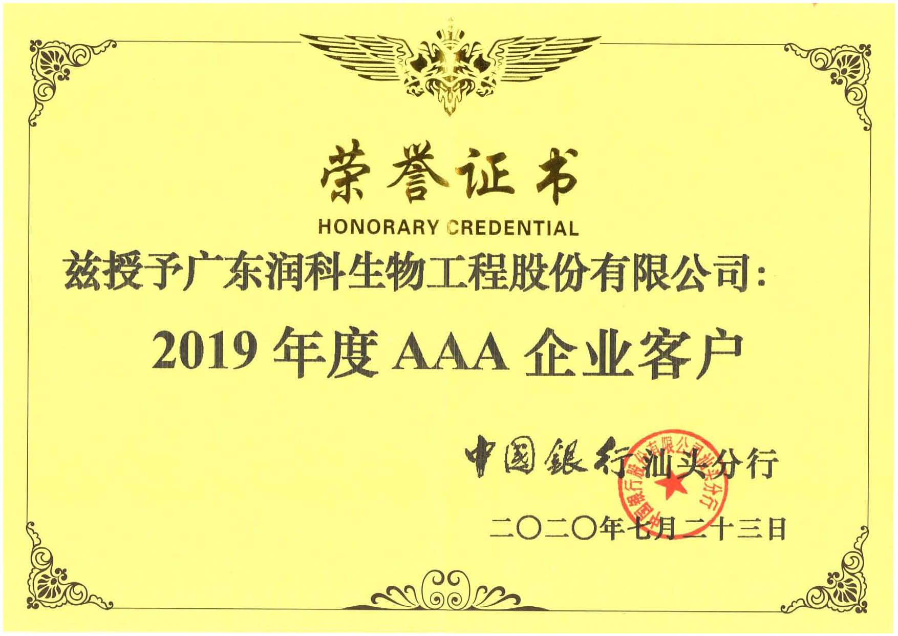 公司榮獲中國(guó)銀行授予2019年度AAA企業(yè)客戶證書