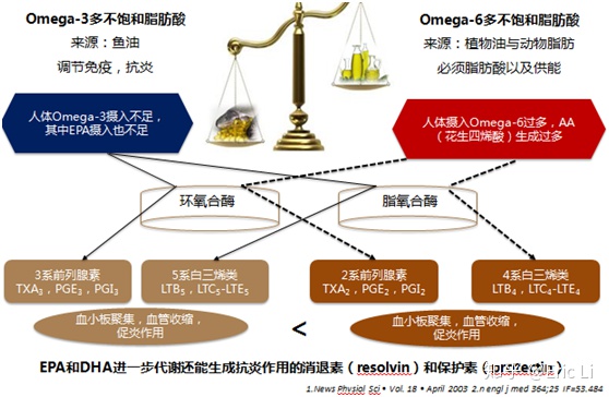 n-3 PUFA與腫瘤預(yù)防的研究始于30年前,但迄今仍存爭議。Brasky TM等認(rèn)為飲食中補(bǔ)充n-3PUFA可以降低乳腺癌的發(fā)病風(fēng)險(xiǎn)(HR=0.68,95%CI=0.50-0.92)。2013年一篇由亞太臨床營養(yǎng)學(xué)會(ASIA-PACIFIC Clinical Nutrition Society)營養(yǎng)與食品安全中心聯(lián)合浙江大學(xué)發(fā)表的一篇關(guān)于乳腺癌風(fēng)險(xiǎn)與Omega-3攝入的Meta分析4涵蓋了20905例乳腺癌病例,883585位統(tǒng)計(jì)自21例獨(dú)立的前瞻性隊(duì)列研究的參與者。結(jié)果發(fā)現(xiàn),每日海洋性來源Omega-3補(bǔ)充量越高,乳腺癌發(fā)病率會有所下降(RR~0.86 (95% CI 0.78 to 0.94), I2=54)),根據(jù)劑量-效果分析,每天每增加100mg的Omega-3攝入,能降低5%的乳腺癌風(fēng)險(xiǎn)。1982年Chavarro JE等對14916例健康男性的血n-3 PUFA作了為期13年的追蹤,最后476例受試者被診斷為前列腺癌患者,與對照組進(jìn)行匹配后發(fā)現(xiàn)血液n-3 PUFA水平降低者前列腺癌的發(fā)病風(fēng)險(xiǎn)增加(RR=0.59,95%CI=0.38-0.93)。Hall MN等對21 406例健康人血n-3 PUFA的濃度作了為期22年的追蹤,最后500例被診斷為結(jié)直腸癌(結(jié)腸癌388例,直腸癌112例),認(rèn)為隨著攝入n-3 PUFA的增多,結(jié)直腸癌的發(fā)病風(fēng)險(xiǎn)降低(RR=0.74,95%CI=0.57-0.95)。然而,Butler LM等的一項(xiàng)前瞻性研究提供了相反的證據(jù),1993~1998年共61321例入組,至2005年12月31日,共確診961例結(jié)直腸癌患者,發(fā)現(xiàn)攝入n-3 PUFA飲食增加了Dukes’C或D期結(jié)直腸癌的發(fā)病風(fēng)險(xiǎn)(HR=1.33,95%CI=1.05-1.70)。出現(xiàn)矛盾結(jié)論的可能解釋是腫瘤的發(fā)生是多因素相互作用的結(jié)果,包括基因背景、生活方式等。而最新發(fā)表在權(quán)威期刊《GUT》上的一篇研究顯示5,高劑量攝入海洋來源Omega-3多不飽和脂肪酸可以降低結(jié)直腸癌所導(dǎo)致的死亡率,對于確診結(jié)直腸癌患者增加Omega-3攝入意義巨大。